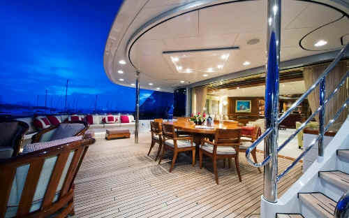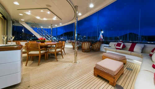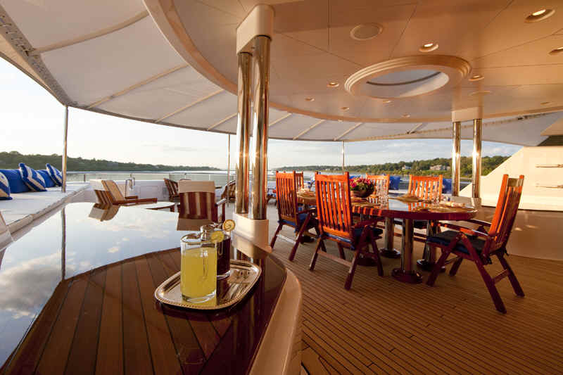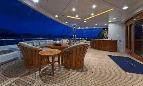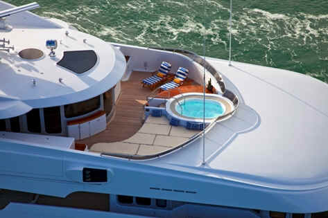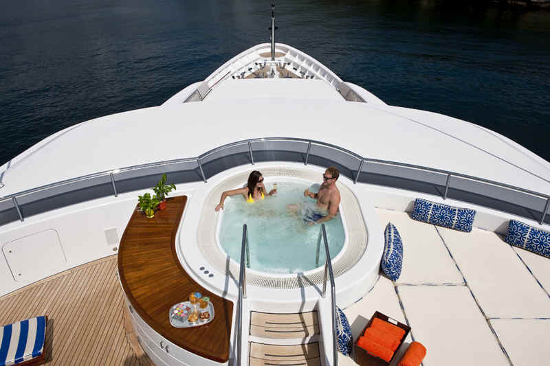 Jacuzzi forward, sunning pads, 2 chaise lounges, wet bar, BBQ, wind doors to