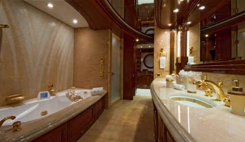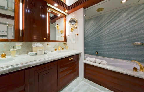private head and twin sinks. Walk-in closet to starboard for Him, walk-in closet