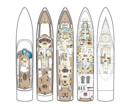 stateroom layout, plus guest gymnasium. All four levels of the yacht are