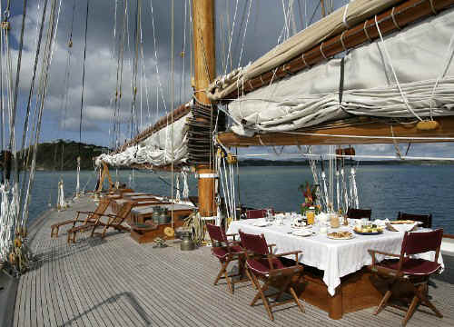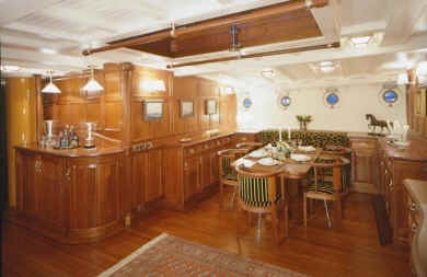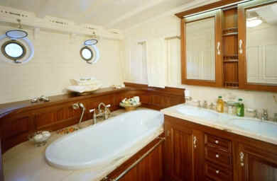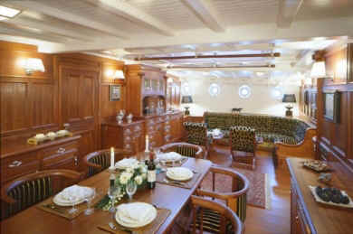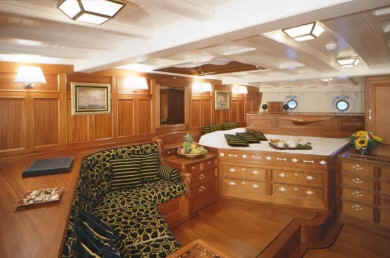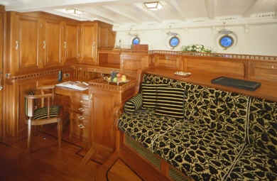 ELEONORA was built following the original lines of the legendary racing schooner Westward. Considered one of the greatest designs by Herreshoff. With no sacrifice to luxurious standards of comfort, her staterooms display the elegance of another age, many of the fittings specially commissioned for her. ELEONORA has a spacious saloon that spans the entire beam of the yacht. Amongst ELEONORA's many original features are the multitude of portholes and skylights which gave her the combination of a spacious and light yet traditional decor. ELEONORA's incredibly wide, uncluttered deck has provision for a large exterior table and seating with pleasant and stylish surroundings. Accommodation is for eight guests in one full width master suite with en-suite bath and two double and one twin guest cabins with shower en-suite.