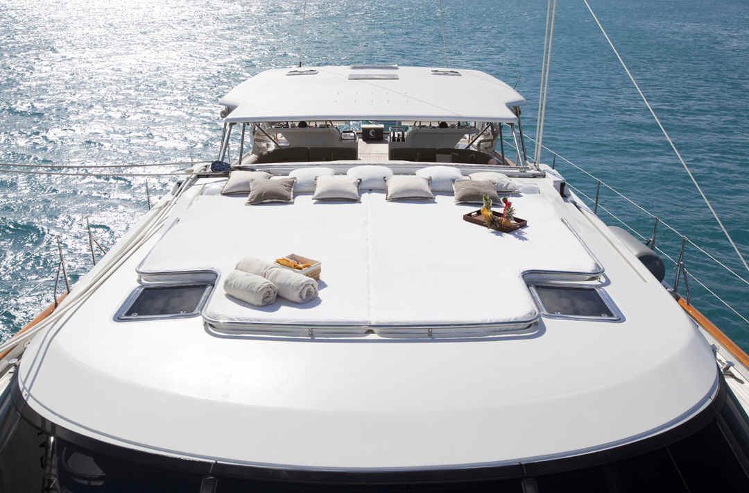 Sailing yacht GENEVIEVE is available for select charter. A wonderful 36.9m sailing yacht, designed by Dubois and built at Alloy Yachts. This is a yacht with a sparkling performance. The yacht accommodates 8/9 guests in the master cabin, VIP double cabin, twin cabin and double cabin with a fixed upper berth, each with a shower room en suite. The yacht's cockpit allows for a flexible layout which can be set as two cocktail tables, one cocktail and one dining table or one large banquette with the custom cushioned insert in the middle capable of seating 10-12 guests.