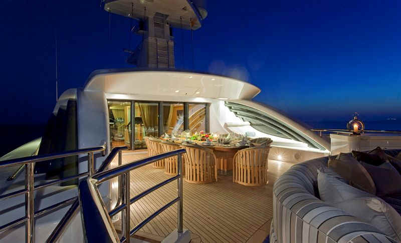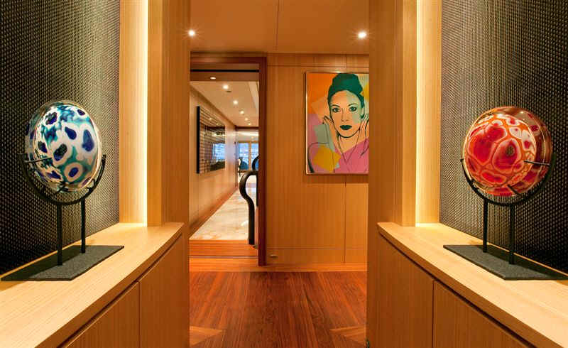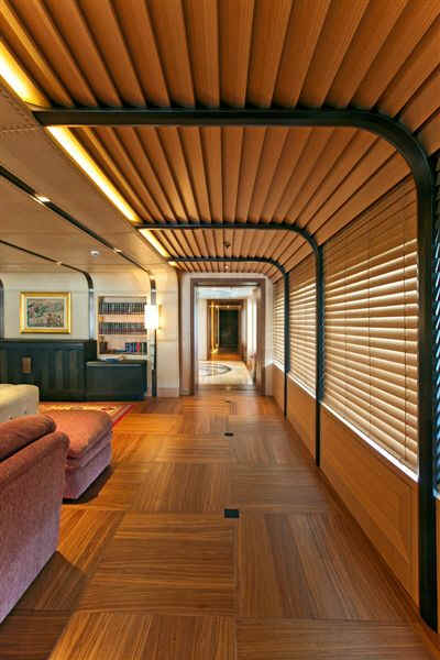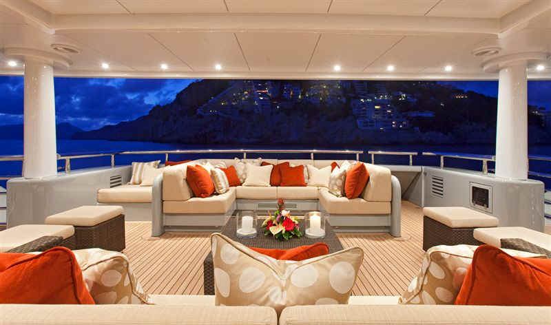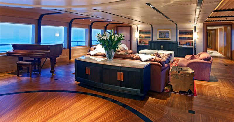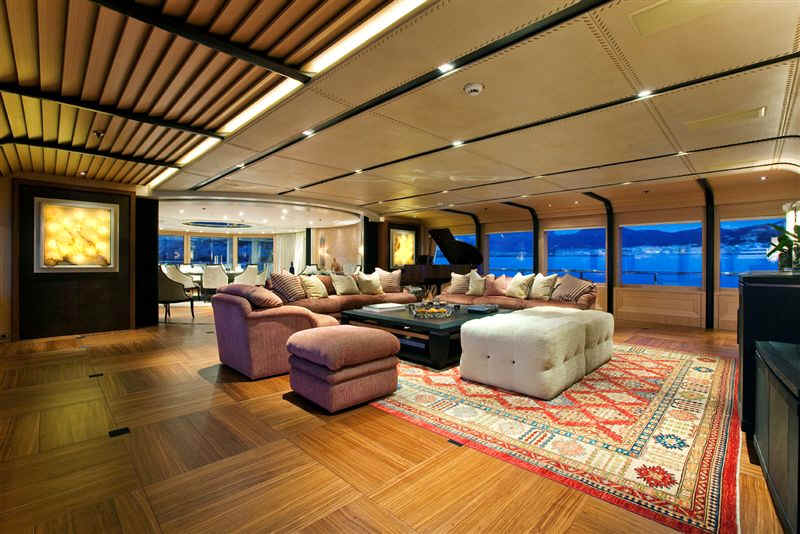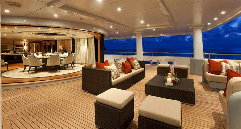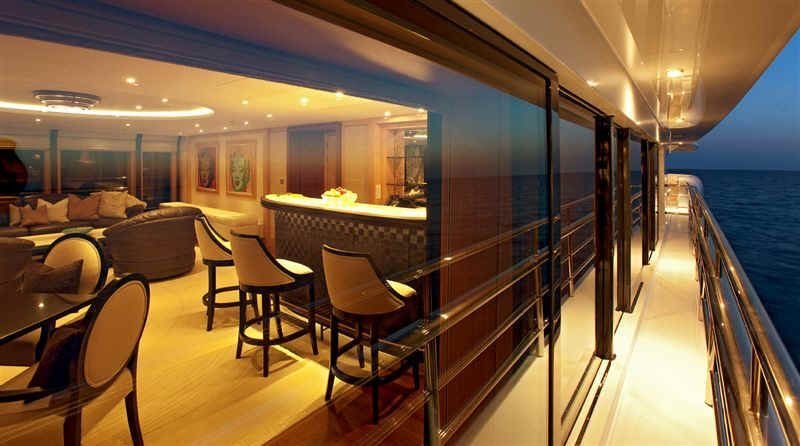 Expansive teak decking brings the club inside, where a bar, entertainment