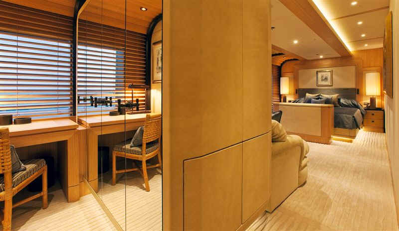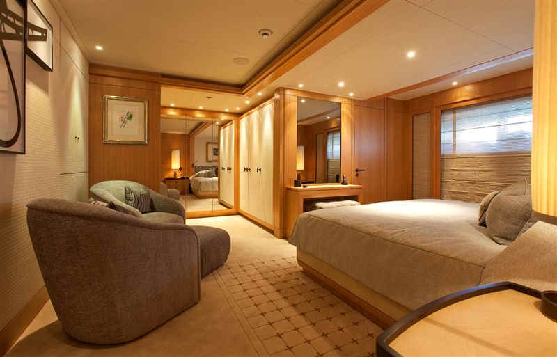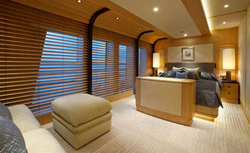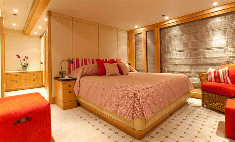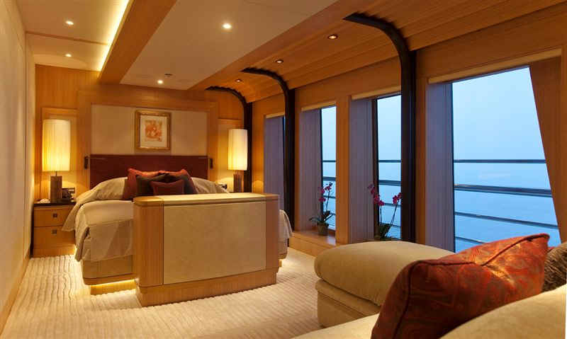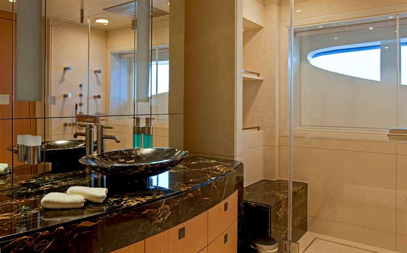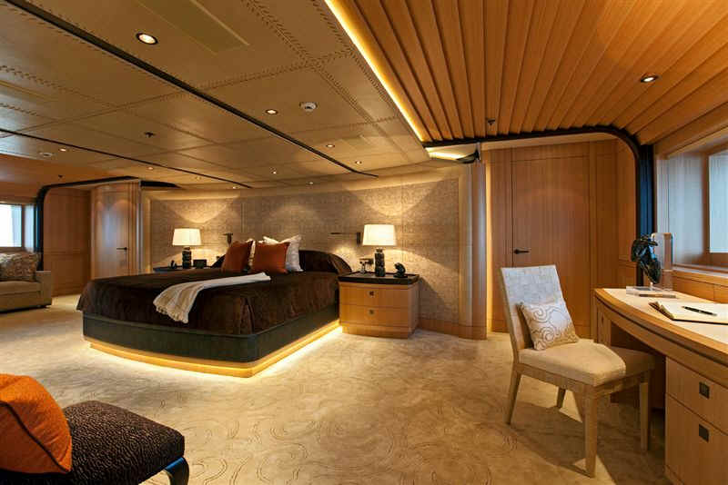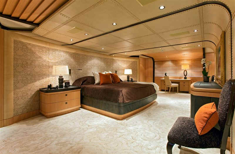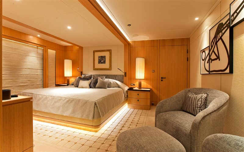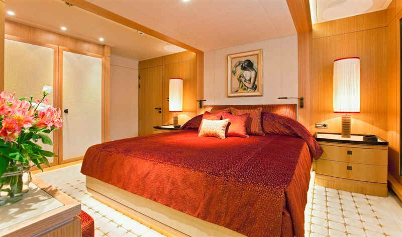 Forward on the Main Deck, the full-width master suite—with deluxe bath,