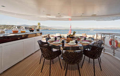 The yachts vast sun deck offers plenty of room for relaxation with a bar, BBQ,