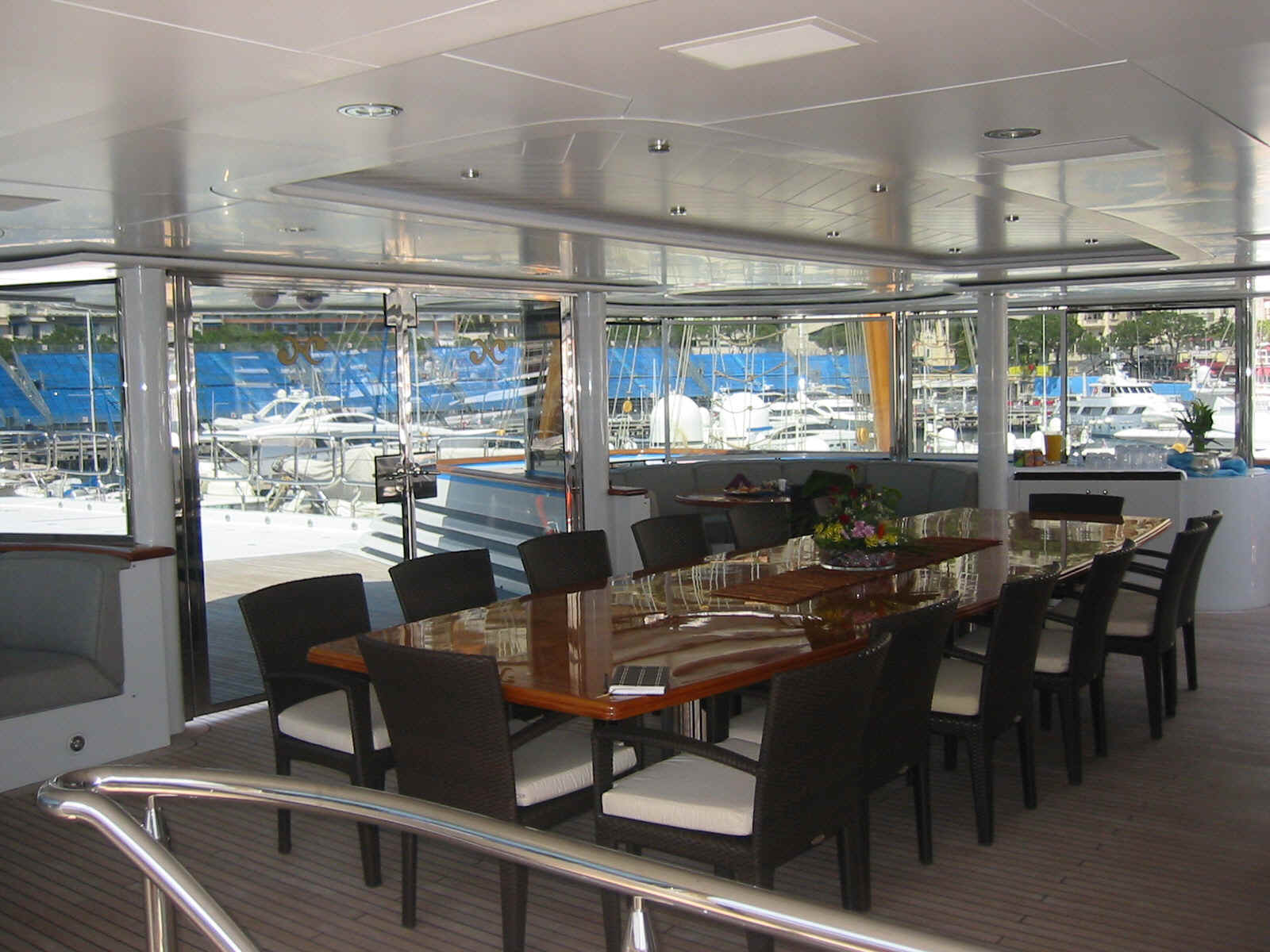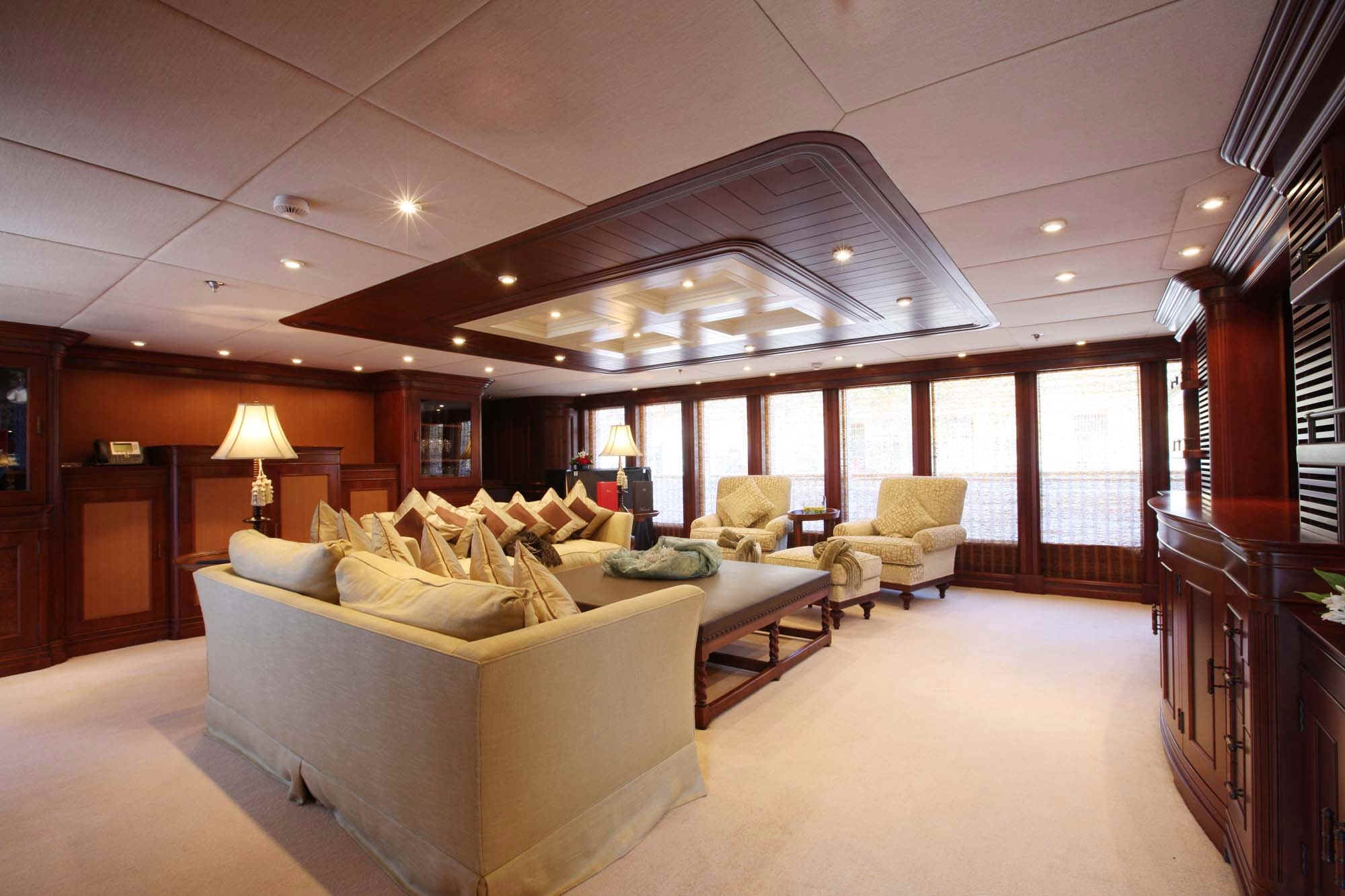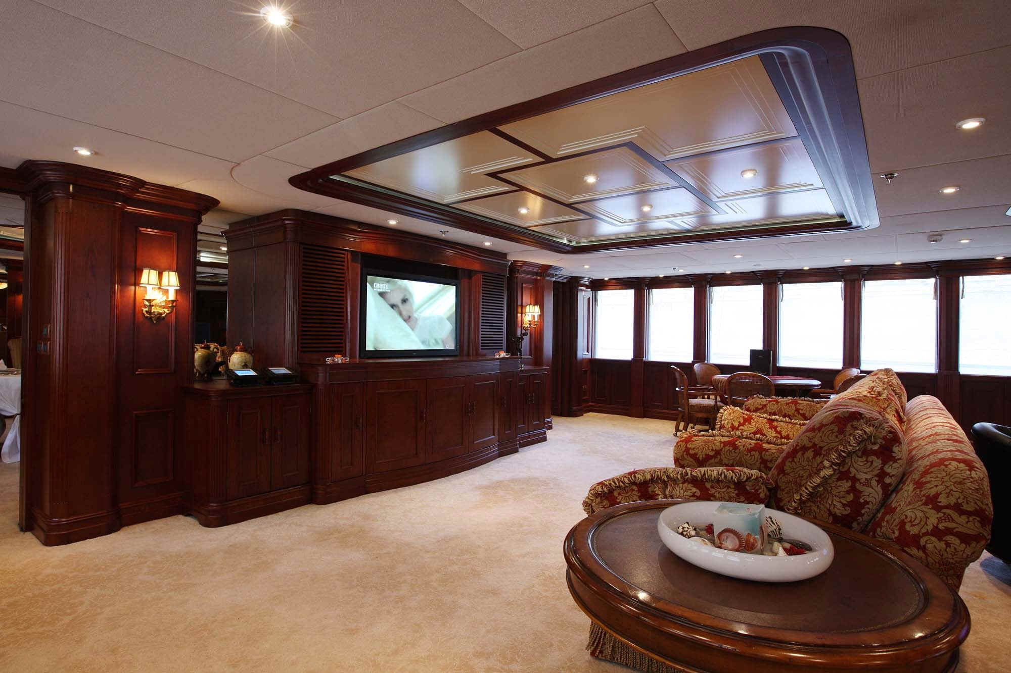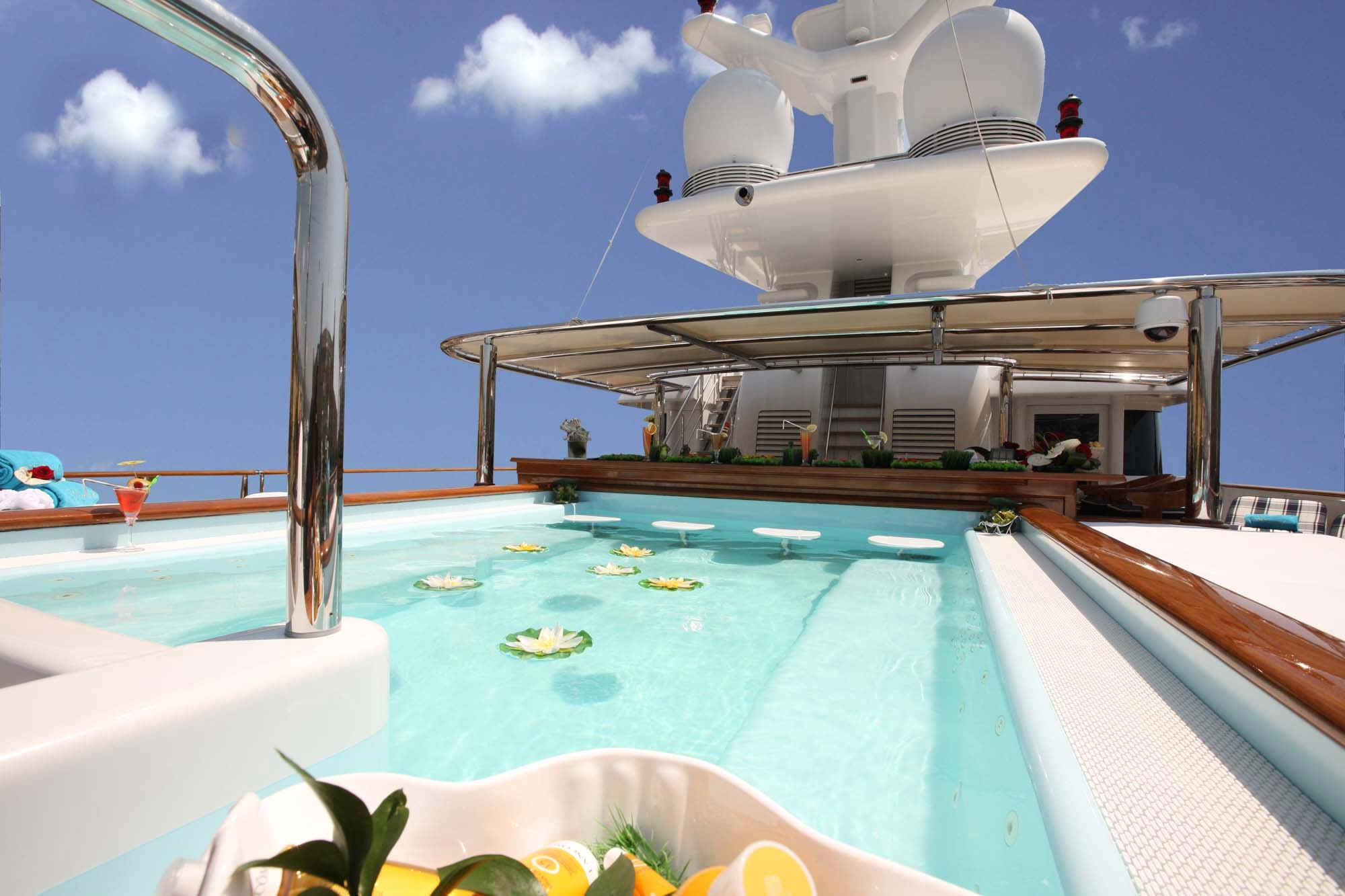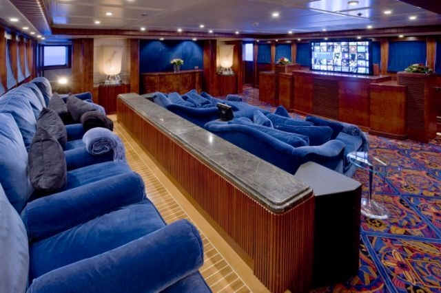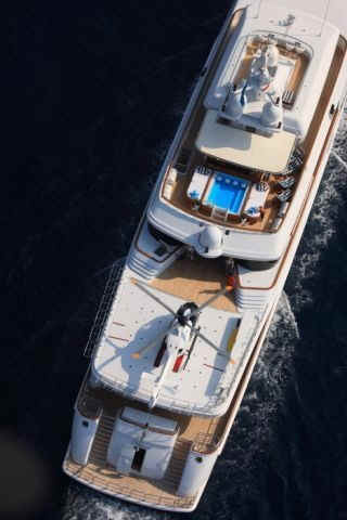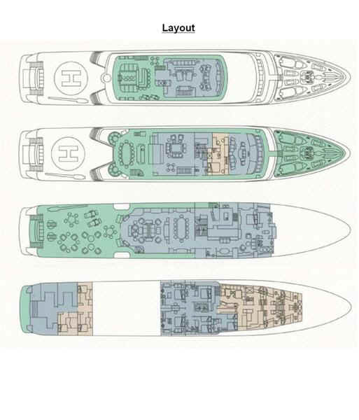 TOYS: 2 “Nautica” Tenders equipped with engine -225 Hp, 2 Jet-skis Yamaha FX SHO Cruiser wave runners, 5-man Towable Banana, Wakeboard package, Water-skis, Bongo Trampoline, Fishing: Comprehensive range of fishing equipment including fishing tackle and rods, Extensive range of water skis/tows/donuts, Diving Equipment “Mares” including fins, masks, tanks, diving compressors, etc. (brand new) for 10 people, Under the Helicopter Deck: 42' Plasma TV, flip down from the overhead, Steinway Piano, Screened massage area, Hammocks, Exercise Equipment including inter alia: 2 treadmills; 2 Exercise machines for pectorals, arms and shoulders and Weight bunch and drum weights