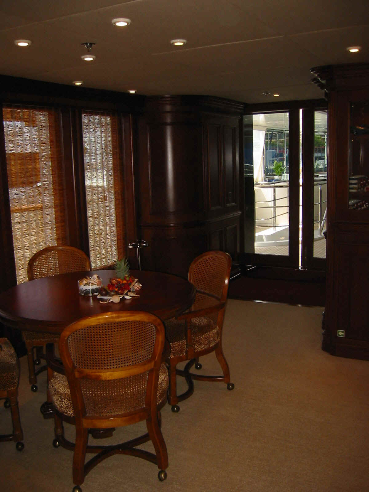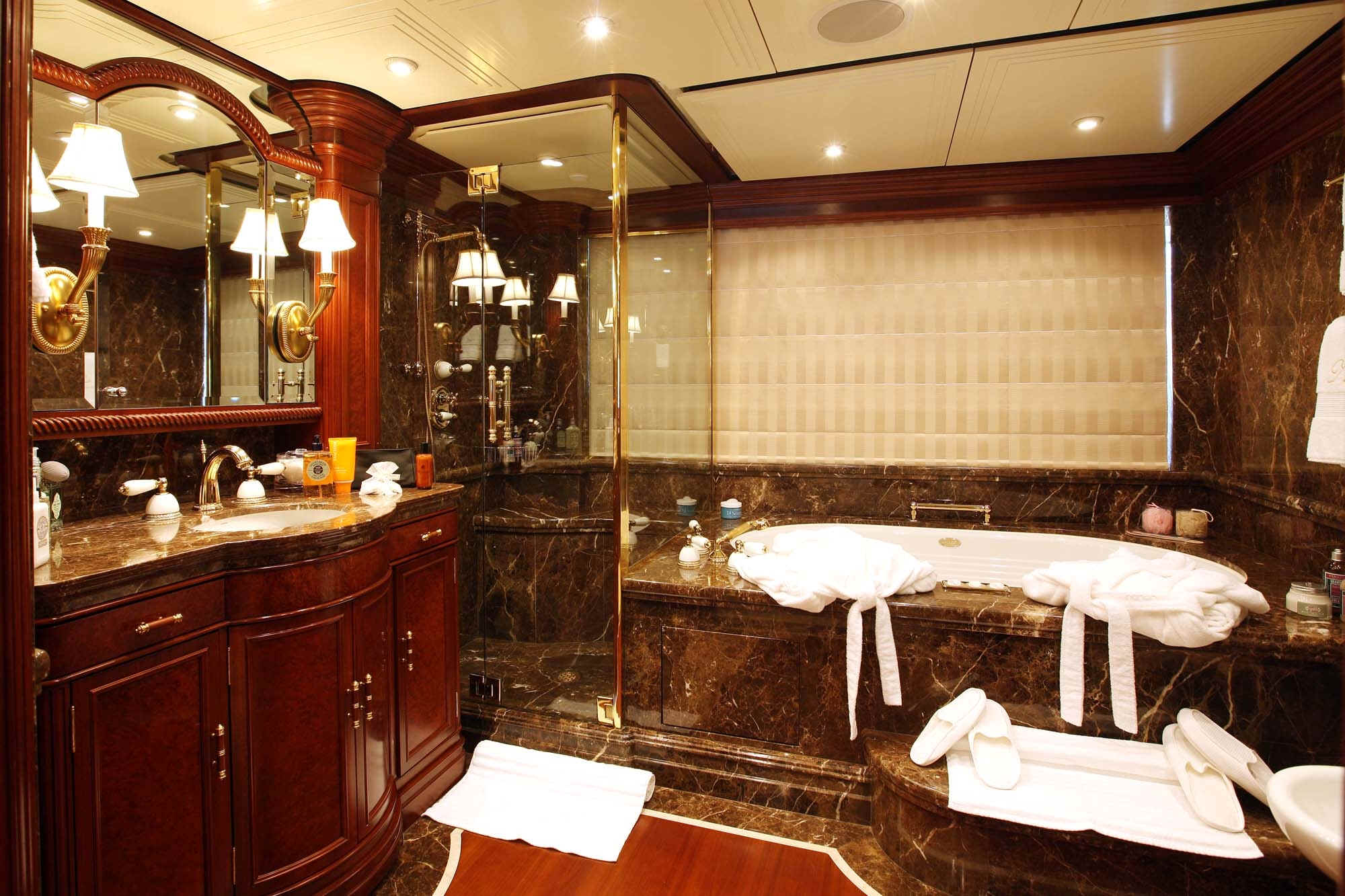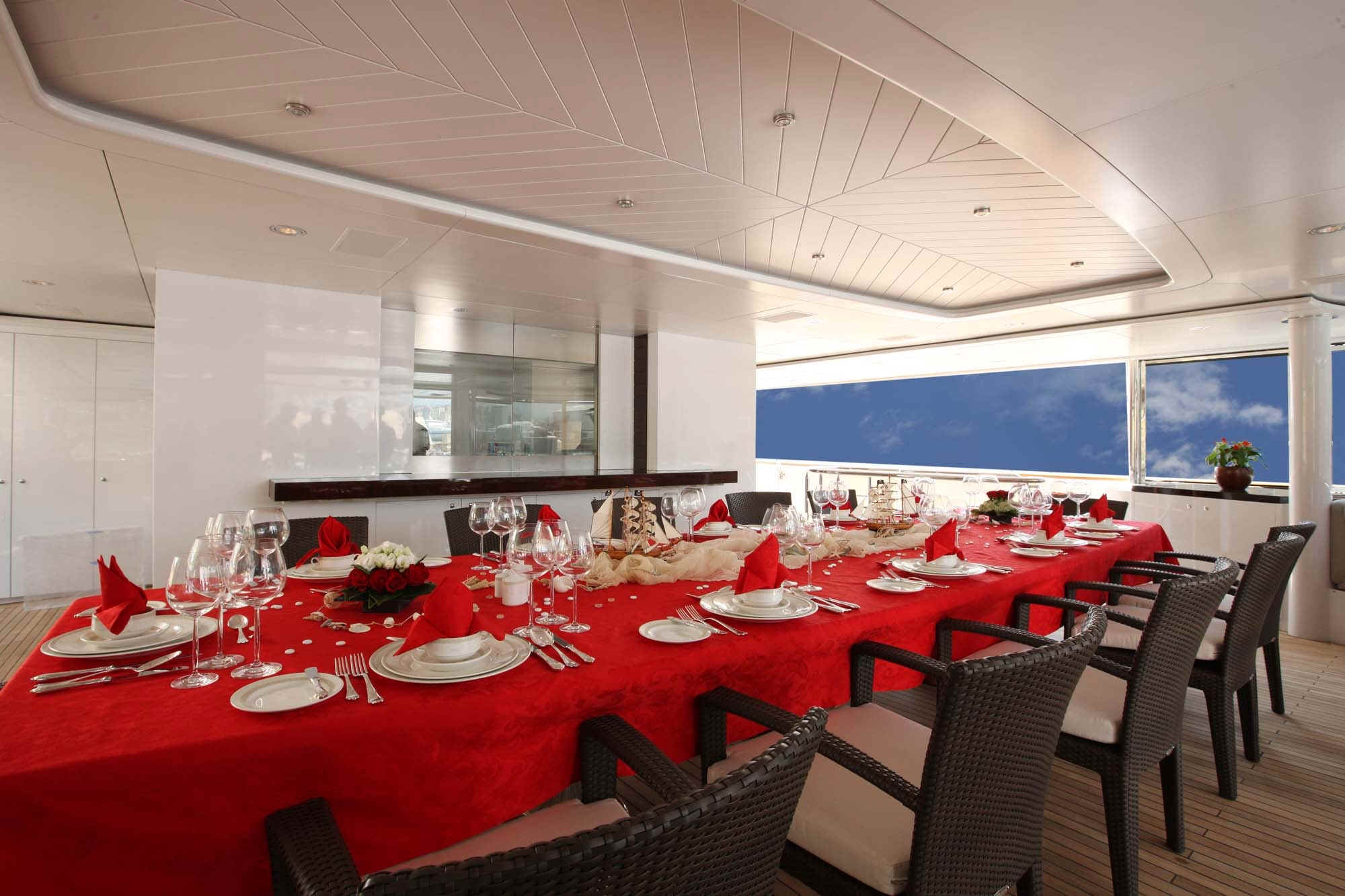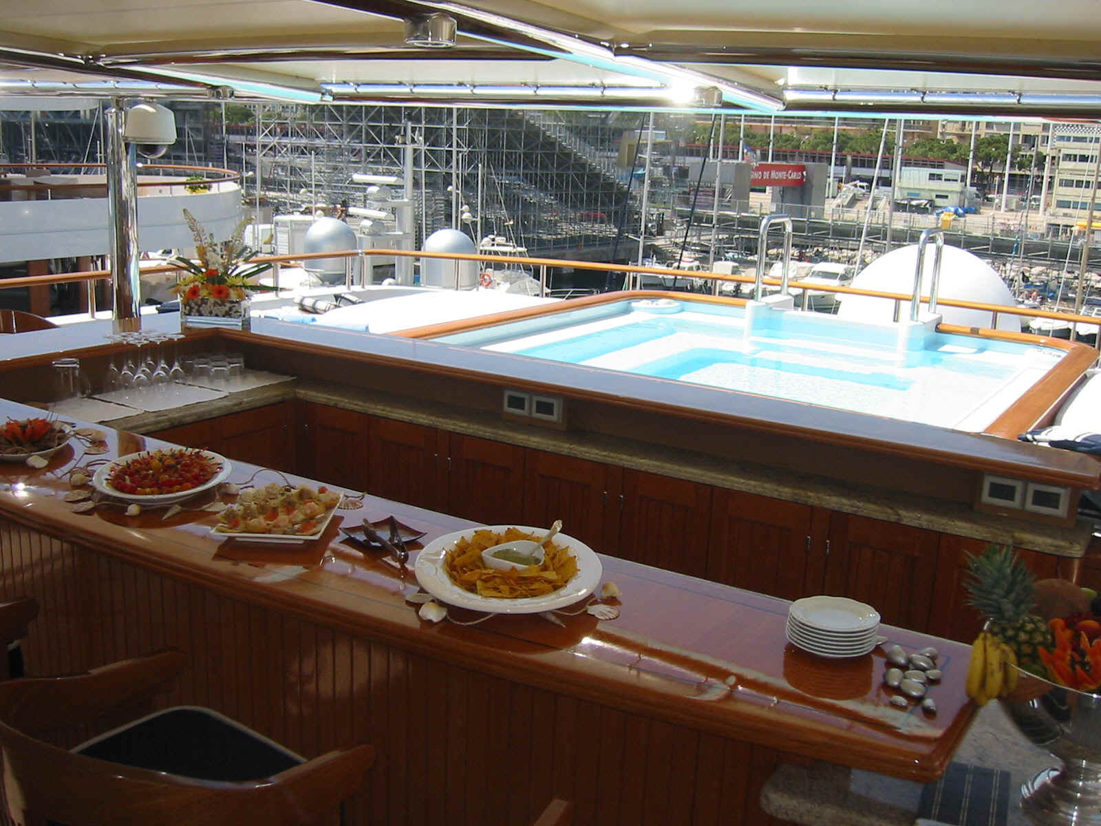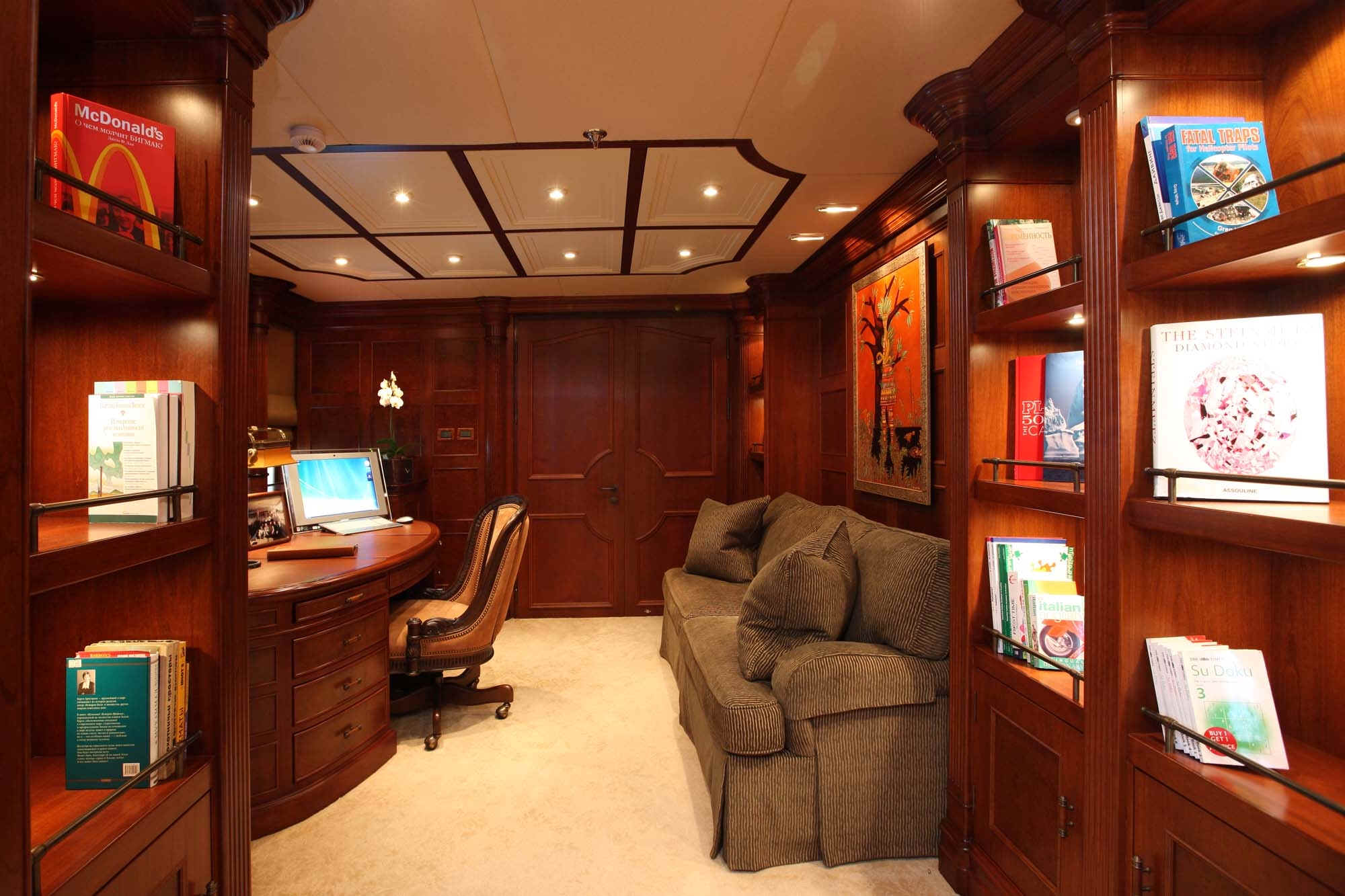 TOYS: 2 “Nautica” Tenders equipped with engine -225 Hp, 2 Jet-skis Yamaha FX SHO Cruiser wave runners, 5-man Towable Banana, Wakeboard package, Water-skis, Bongo Trampoline, Fishing: Comprehensive range of fishing equipment including fishing tackle and rods, Extensive range of water skis/tows/donuts, Diving Equipment “Mares” including fins, masks, tanks, diving compressors, etc. (brand new) for 10 people, Under the Helicopter Deck: 42' Plasma TV, flip down from the overhead, Steinway Piano, Screened massage area, Hammocks, Exercise Equipment including inter alia: 2 treadmills; 2 Exercise machines for pectorals, arms and shoulders and Weight bunch and drum weights
