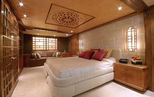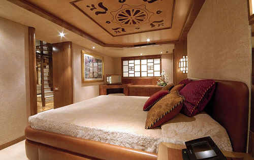 The VIP cabin boasts a queen-size bed dressed in leather with soft wooden
