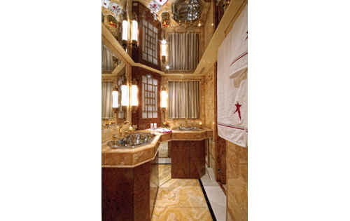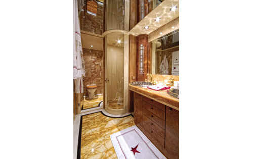 freely. In the master cabin bathroom, the surfaces are dressed in gold and