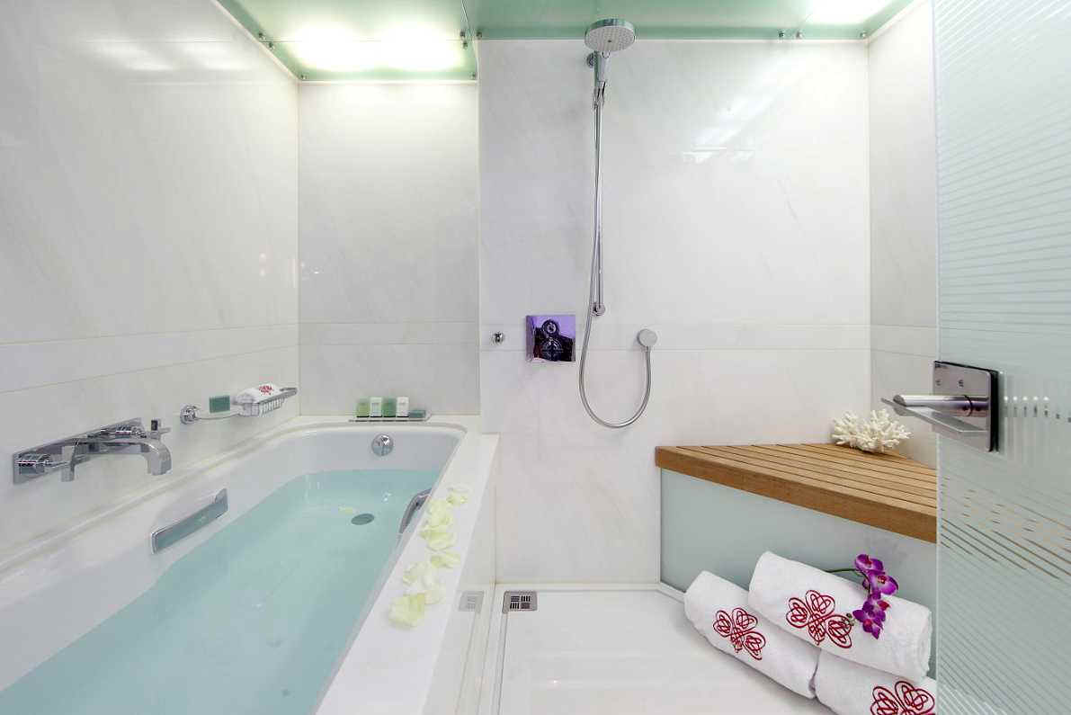 on the port side. All guest suites have expansive portholes, electric blinds,