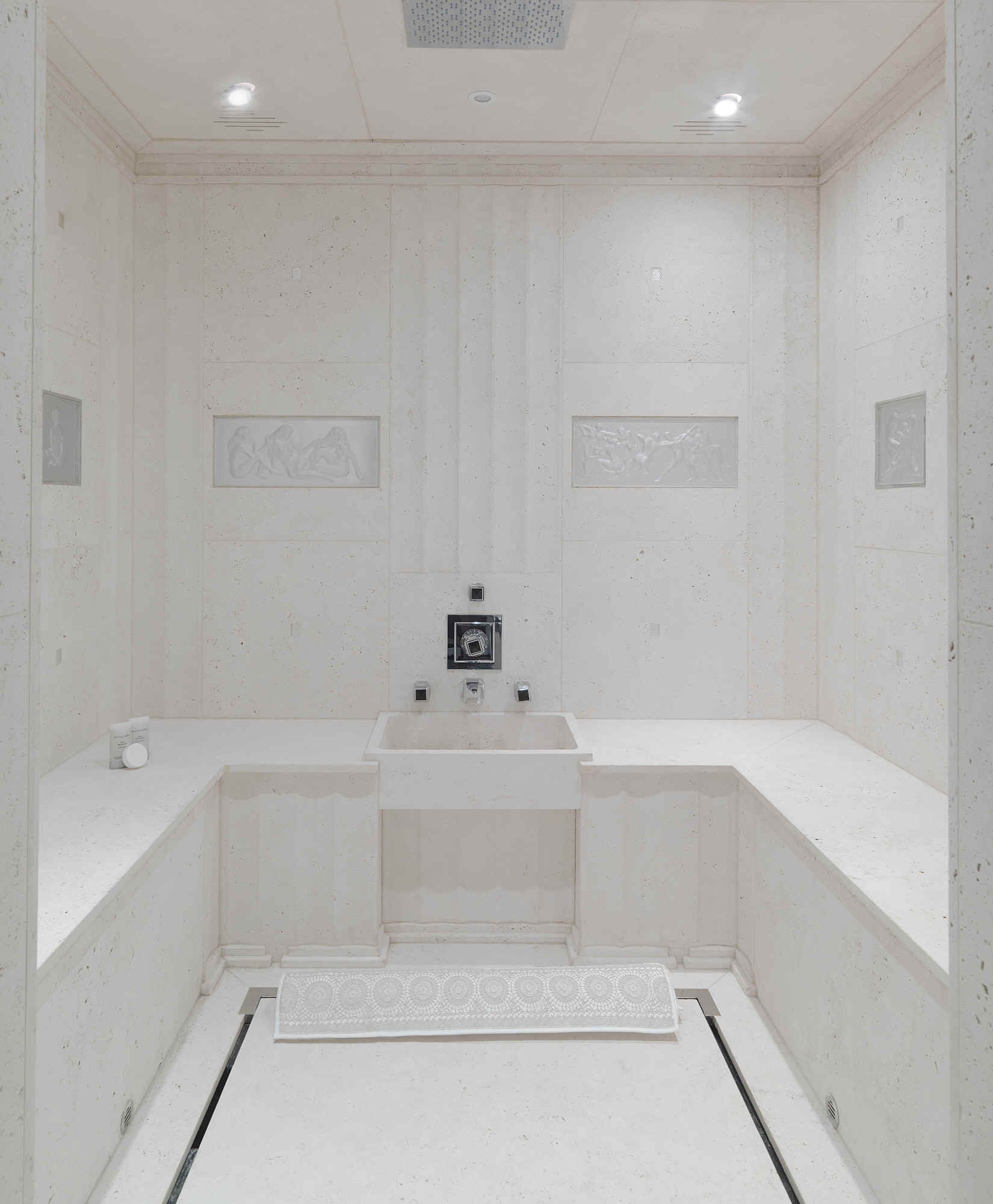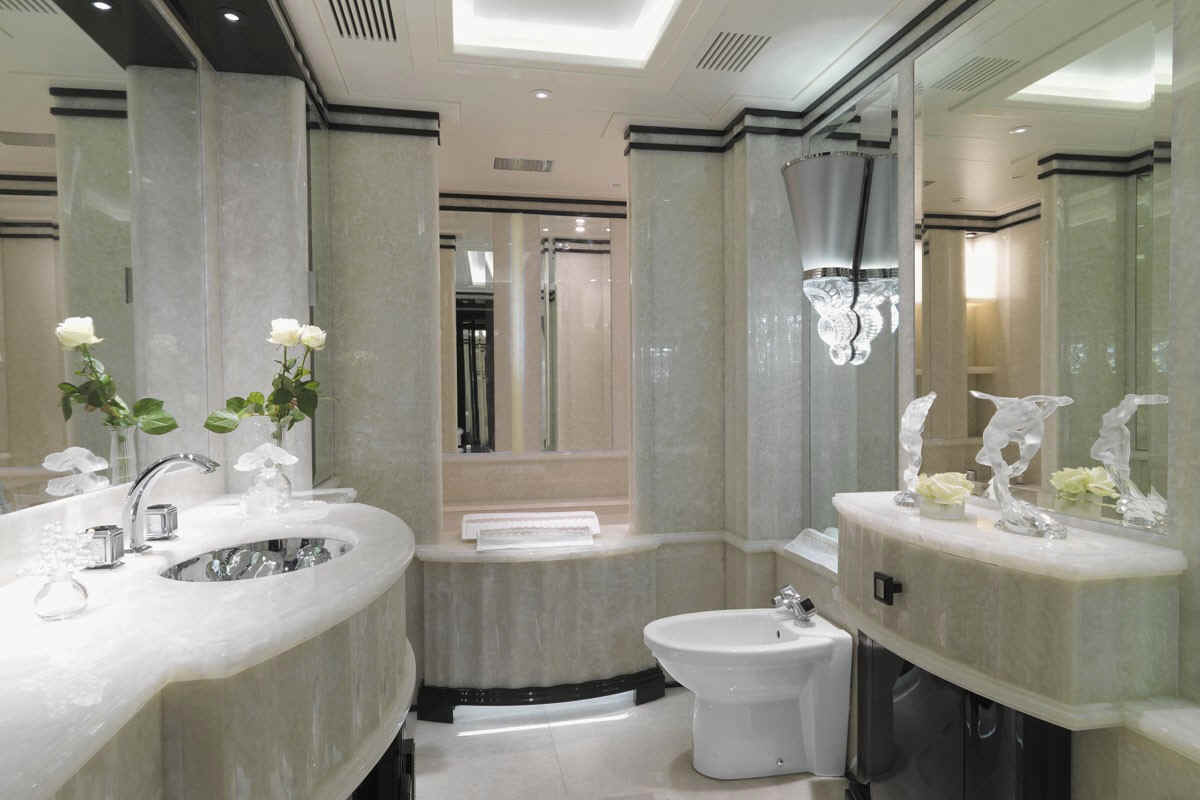 paneling and built in furniture which is complemented by white Onyx, silver leaf