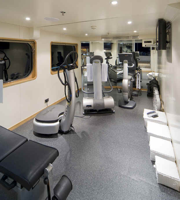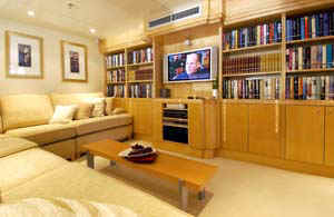 On the upper deck is a library (with additional flatscreen / dvd), gymnasium and