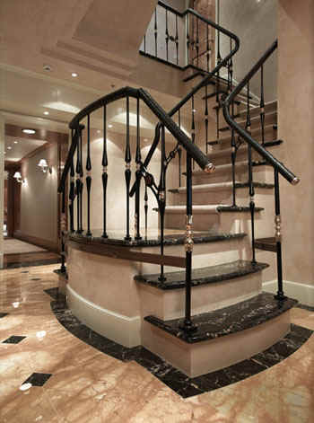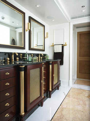 materials. Carrara marble and light oak panelling with burl-oak inlays form the